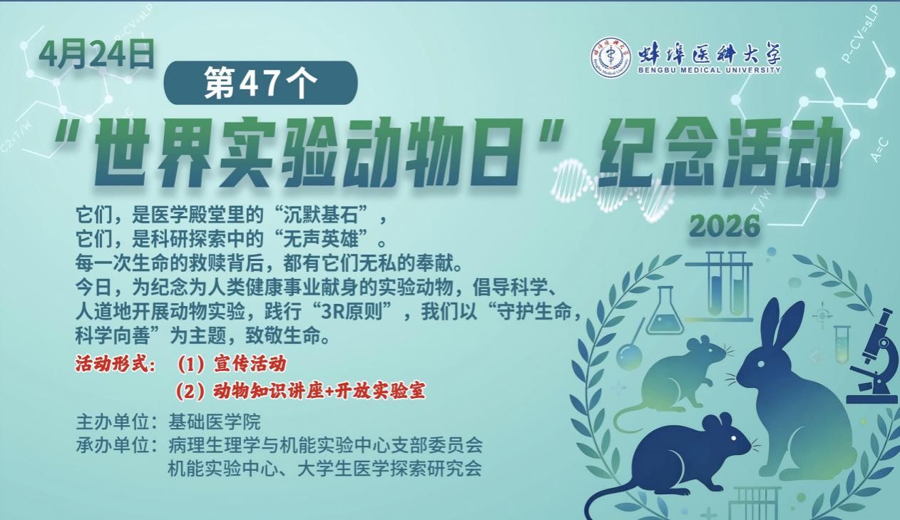 为纪念人类医学进步作出贡献的实验动物,引导师生尊重生命、善待实验动物、树立科学向善的理念,4月24日“世界实验动物日”当天,必威betway西汉姆联在校园内组织开展了以“守护生命,科学向善”为主题的系列纪念活动。本次活动由必威betway西汉姆联主办,病理生理学与机能实验中心支部委员会、机能实验中心及大学生医学探索研究会承办。涵盖主题宣传、有奖问答、社交媒体互动、动物知识讲座及实验室开放日等环节,吸引了全校数百名师生积极参与。